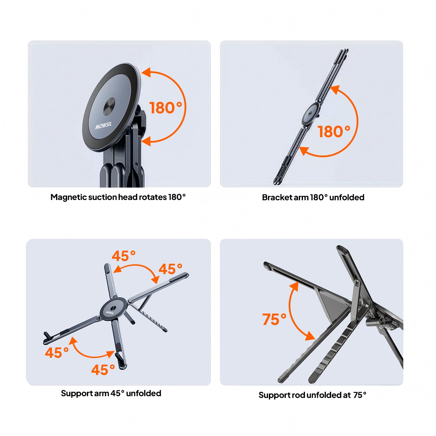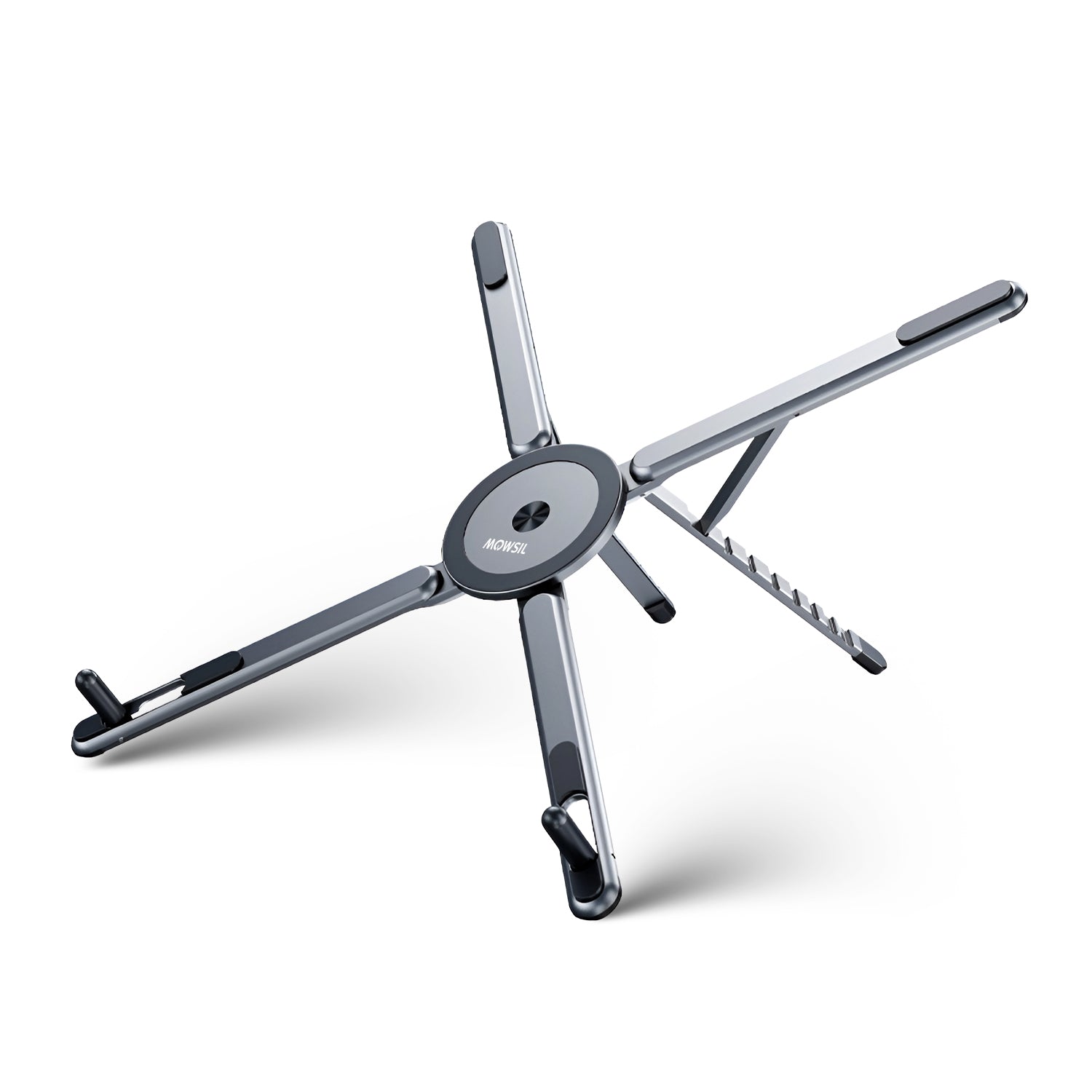 a laptop riser, a tablet easel, and a magnetic phone holder into one sleek, foldable device, it