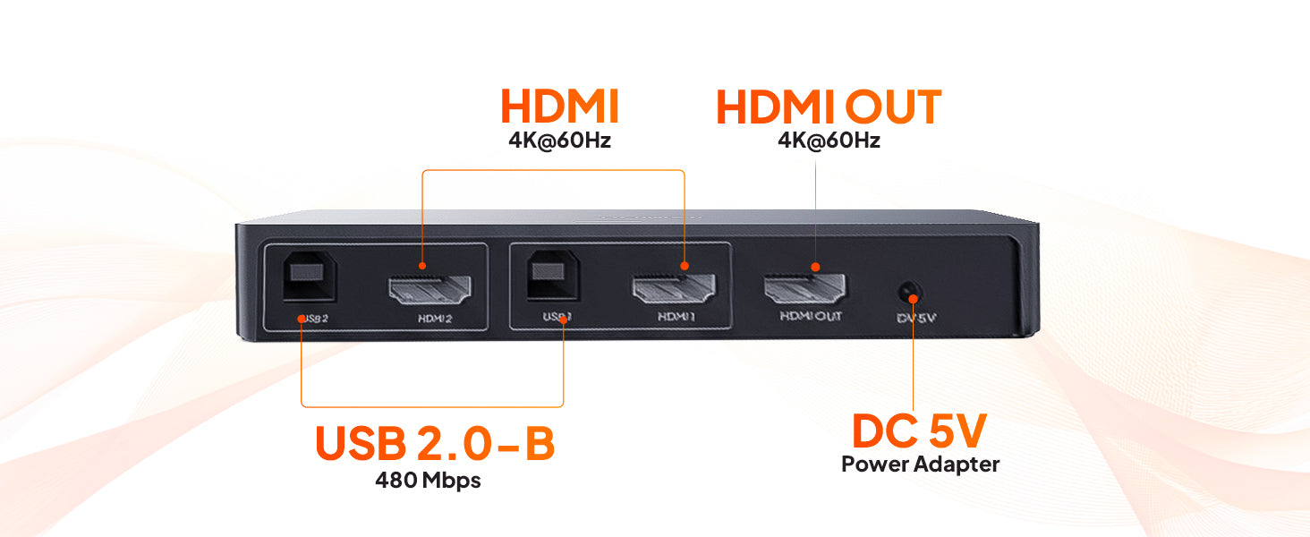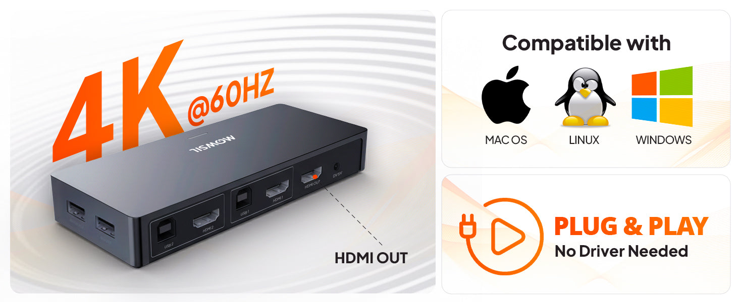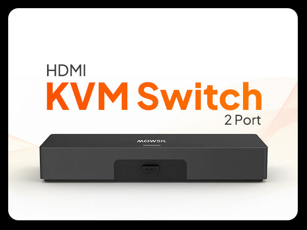 The Mowsil HDMI KVM Switch (2-Port 4K 60Hz) allows users to control two computers, laptops, or game consoles using a single USB keyboard, USB mouse, and HD monitor. Designed for multitasking and efficient workflow, it enables quick switching between systems through a convenient top-mounted button. Supporting resolutions up to 3840 × 2160 (4K) at 60Hz, this plug-and-play device requires no software or drivers, ensuring easy setup and reliable performance for both office and home use