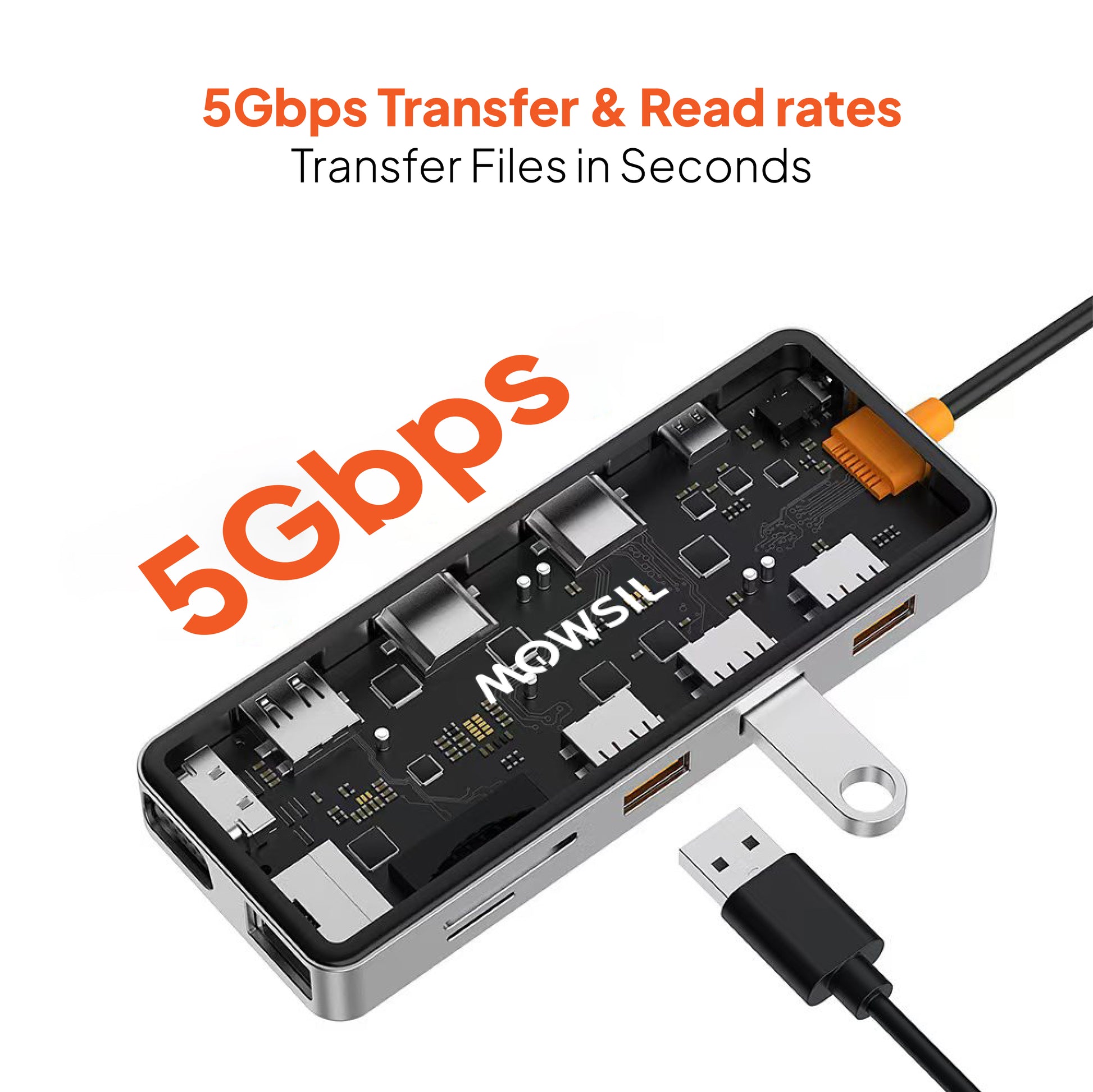 - 12-in-1 USB C Hub: 1x Type C, 4 x USB Type A (3.0) 5 Gbps, 2x HDMI 4k 30 Hz Port, SD/TF Card Reader, 3.5mm Audio Jack, VGA and LAN/RJ45 GIGA. Perfect to connect USB flash drive, external hard drives, Monitor, mouse, keyboard, portable hard drive, card reader and other accessories.